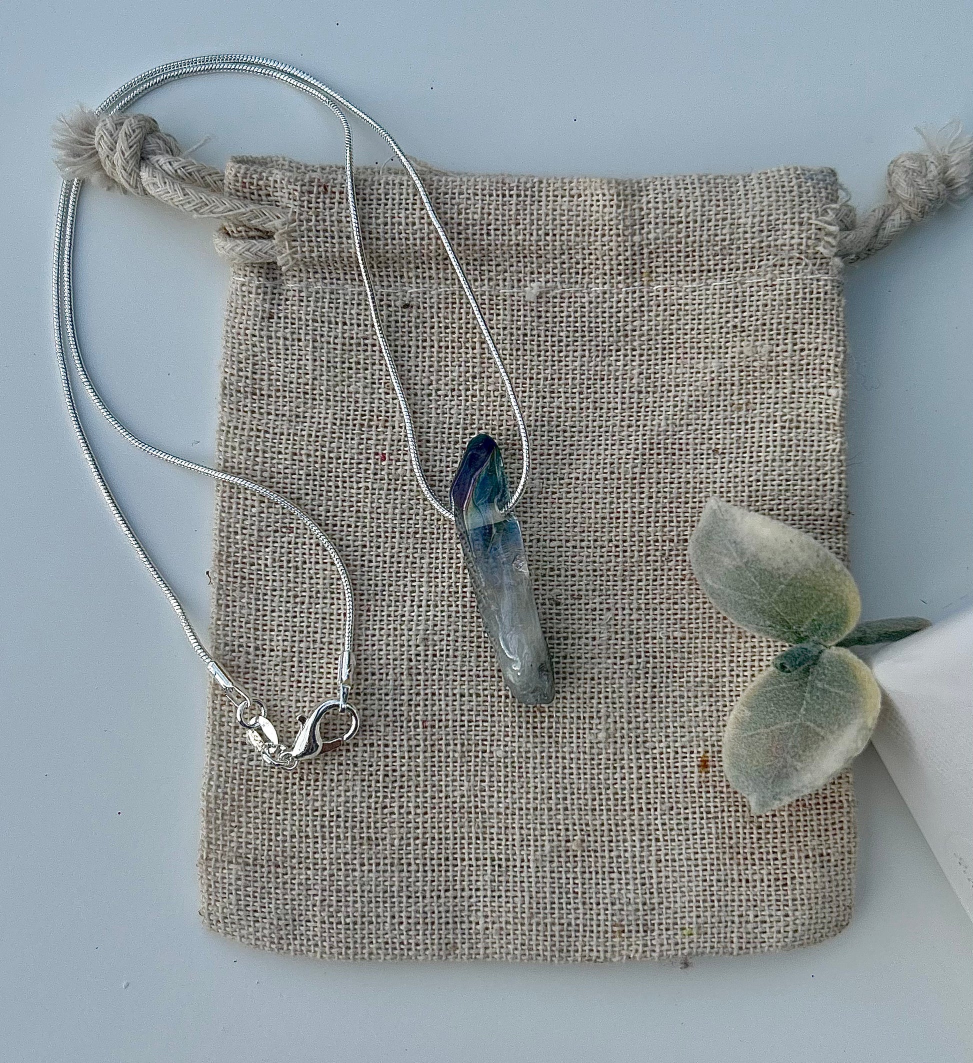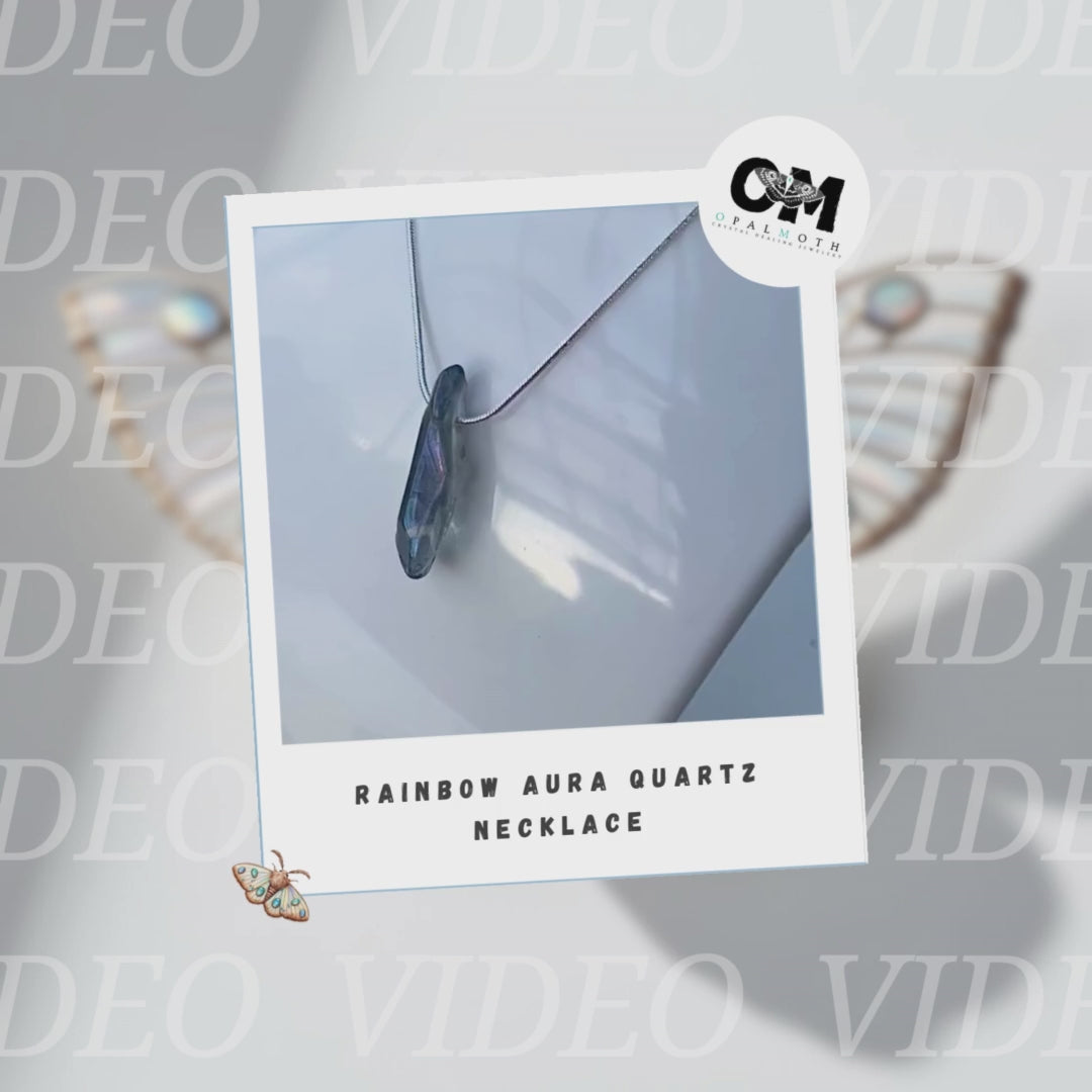 The Rainbow Aura Quartz necklace is a stunning piece, featuring a single rainbow aura quartz gemstone on a 16-inch sterling silver snake chain. The stone’s iridescent finish creates a captivating display of rainbow colors when it catches the light, adding a touch of magic to any look.