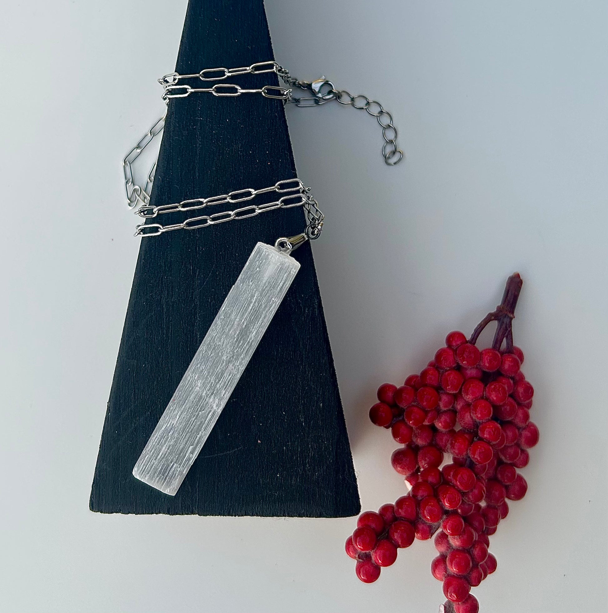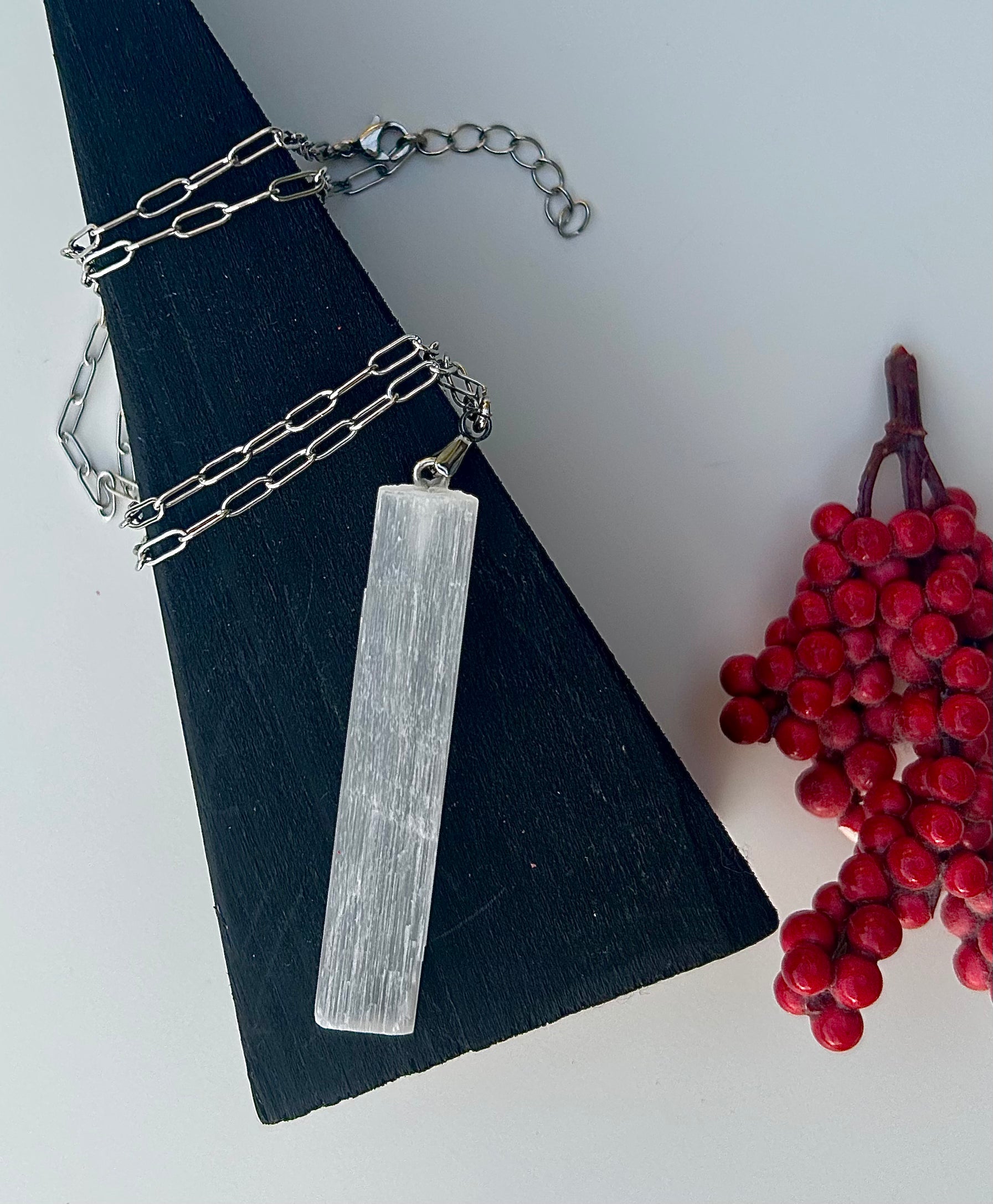 This necklace features a raw selenite crystal in a rectangular shape, set on a durable stainless steel paperclip chain (17-18 inches).