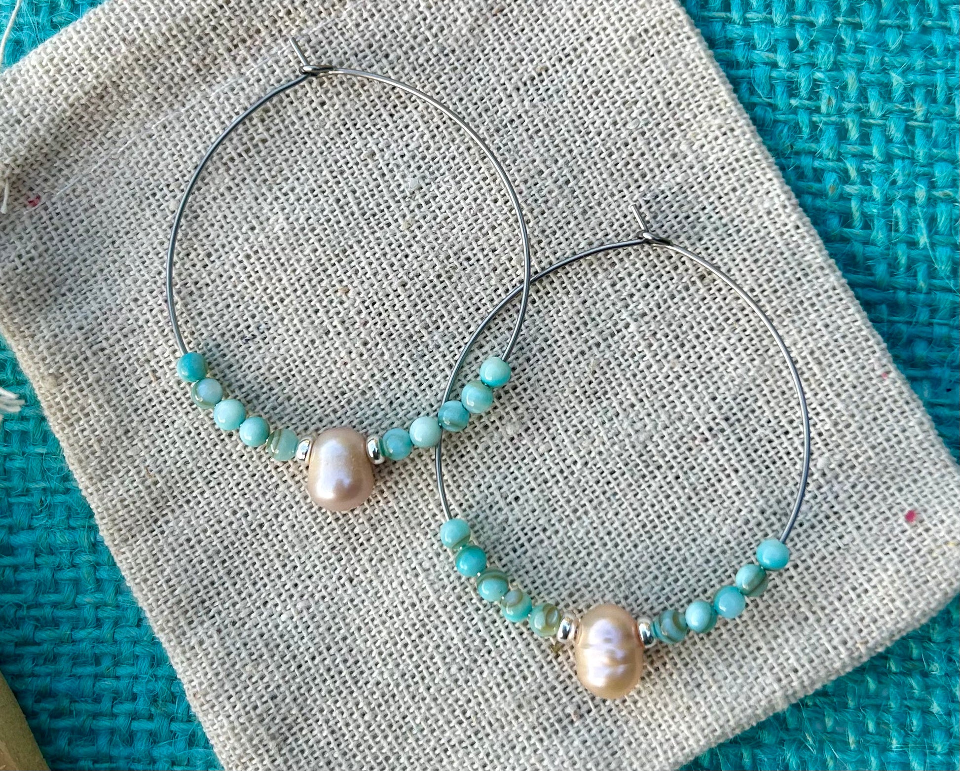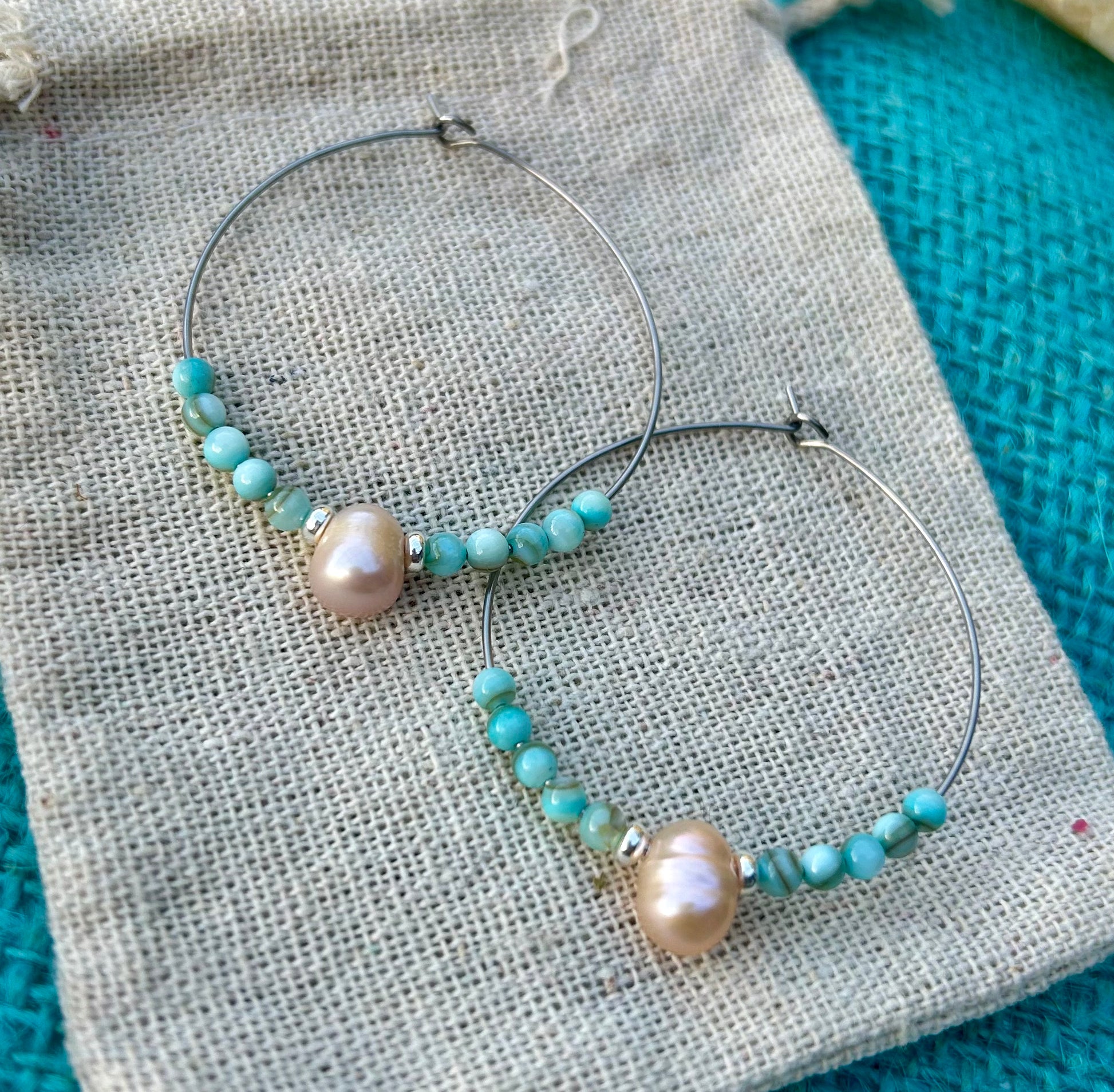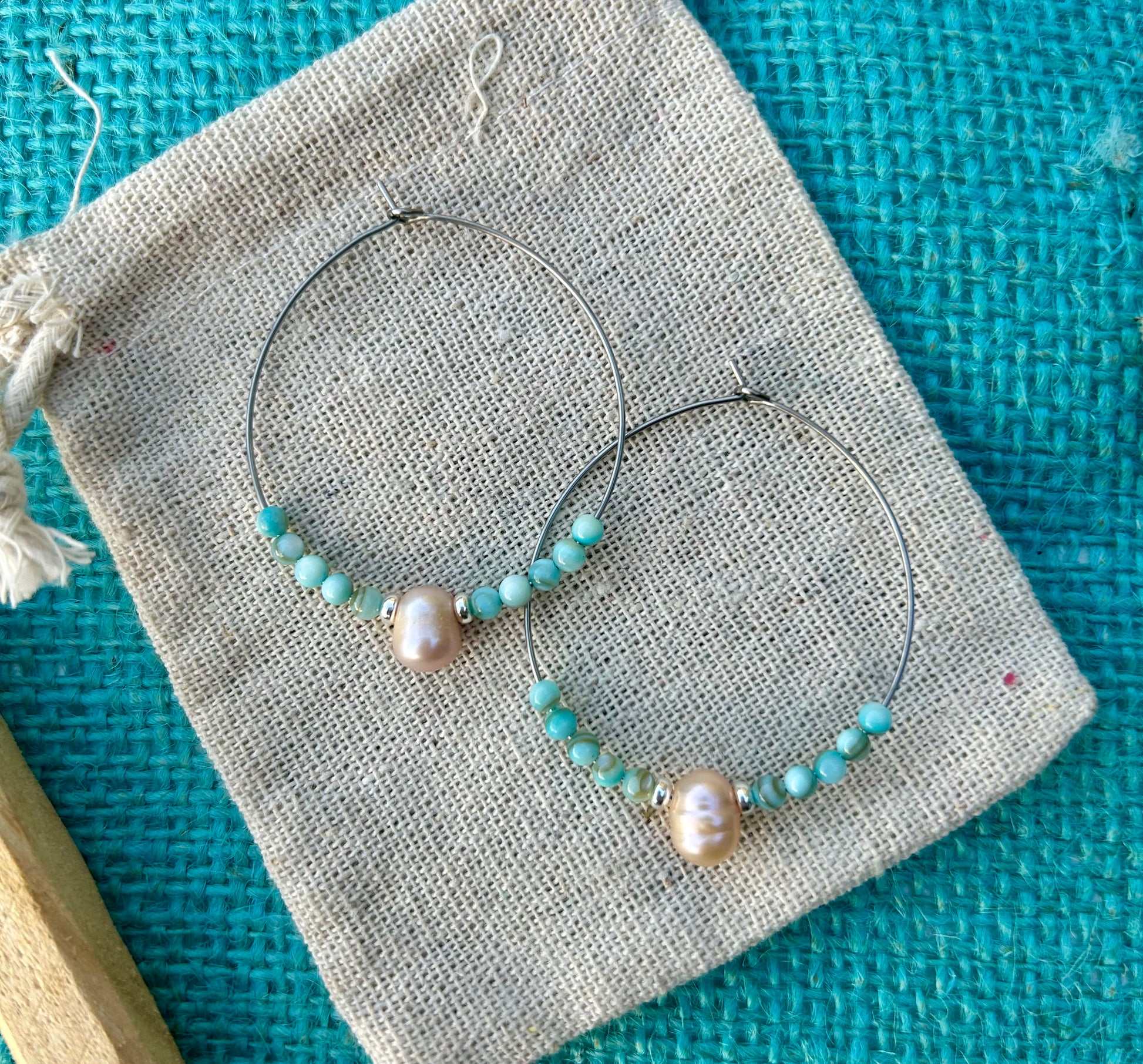 These enchanting hoop earrings feature a bold stainless-steel hoop, adorned with shimmering teal seashell beads and a single freshwater pearl. Reflecting the ocean's natural palette, the beads transition from soft turquoise to deeper blues, evoking the mystique of the sea. Sterling silver accents add a touch of elegance.